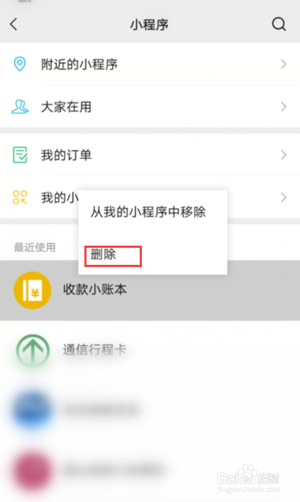 微信收款小账本可以直接在微信小程序里面将其删除,之后就不会出现了,具体操作如下: