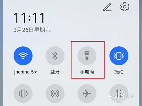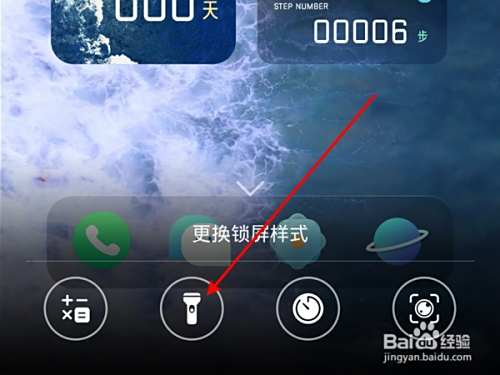 从屏幕底部向上滑动点击手电筒图标即可通过快捷键打开手电筒;如图