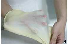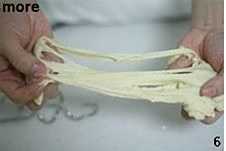 继续揉,使面筋达到最强韧的结构,即可以形成完美薄膜的完成阶段。这是时候的面团具有最好的弹性,面团的表现为软硬适中,表面具有漂亮的光泽。