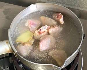 取一口锅开水烧沸,下两个姜片,把鸡翅焯一下,鸡肉颜色变了就好,不用很长时间!捞出