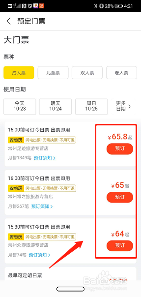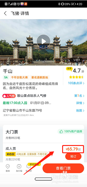 点击搜索到的景点,即可进入门票预订界面。成人票单张价格可便宜十四元。