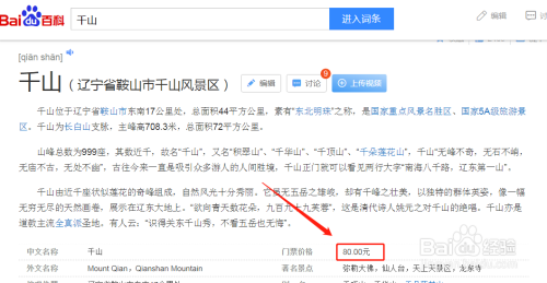 首先可以先通过浏览器搜索一下千山门票的价格,百度百科给的参考价为成人价80元一位。