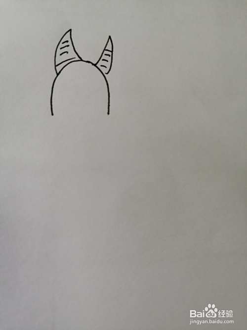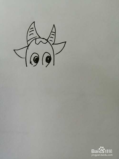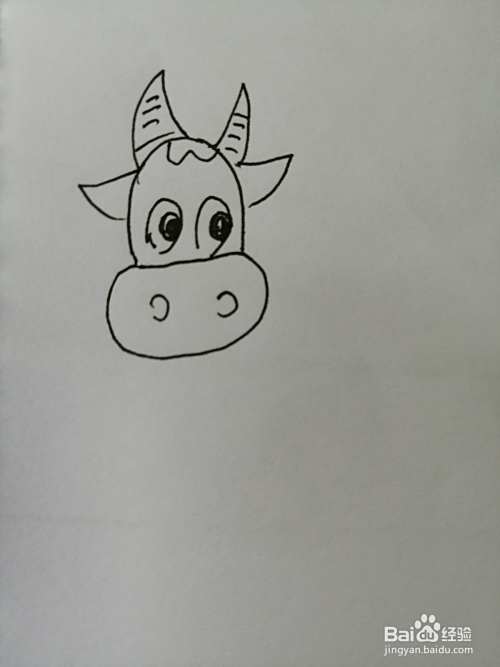 第一步,我们先把可爱的小牛的头和牛角画出来,注意牛角纹路的画法。