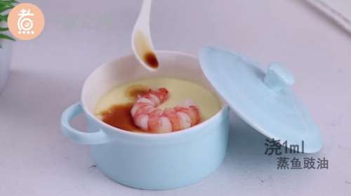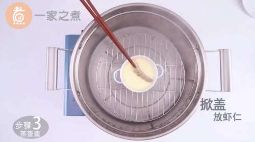蒸蛋羹,水开放入蛋碗,蒸10分钟,掀盖放入虾仁。