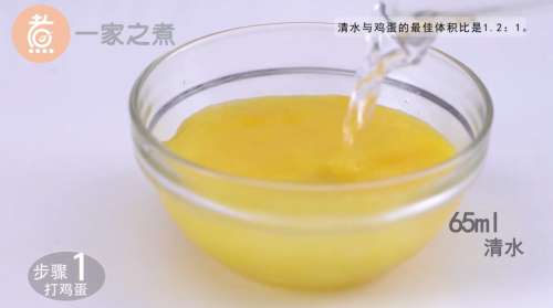 碗中打入鸡蛋,加入盐,65毫升清水,搅拌均匀,过筛两遍。