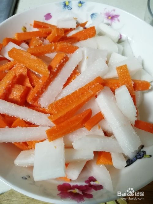 将切好的白萝卜、胡萝卜加勺食用盐、2勺白糖搅拌均匀。腌制15分钟。