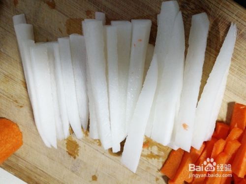 白萝卜、胡萝卜切成小长条。胡萝卜其实不宜与白萝卜搭配食用,我只是起点缀作用,所以也可以少放一点。