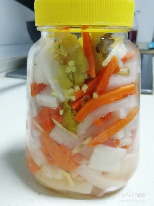 15分钟后,将腌好的白萝卜、胡萝卜、姜丝一起装入玻璃瓶内。