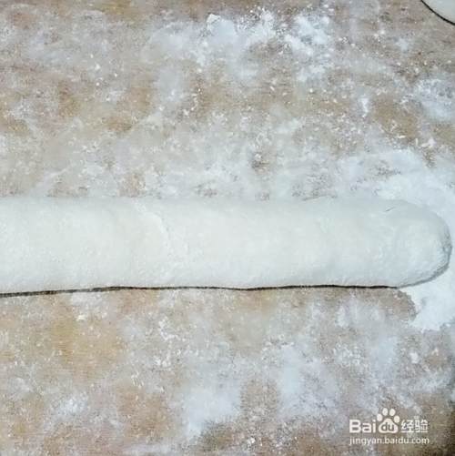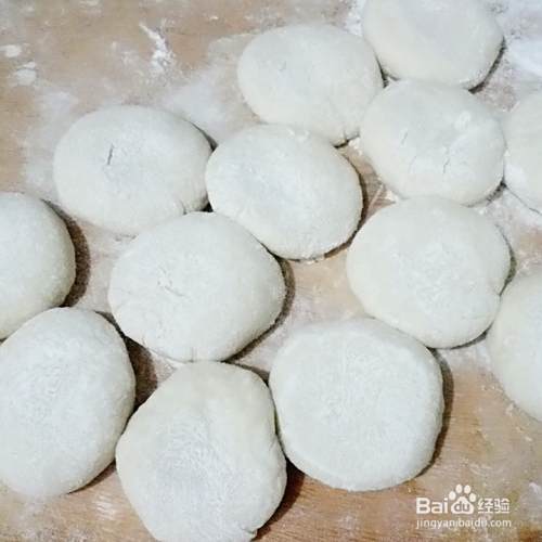 面团发酵至原面团一倍大时,将面团揉成长条,做成小剂子,压成圆饼。
