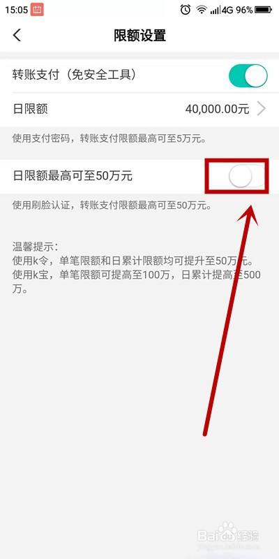 进入【限额设置】页面后,点击【日限额最高可提升至50万元】选项的功能开关。