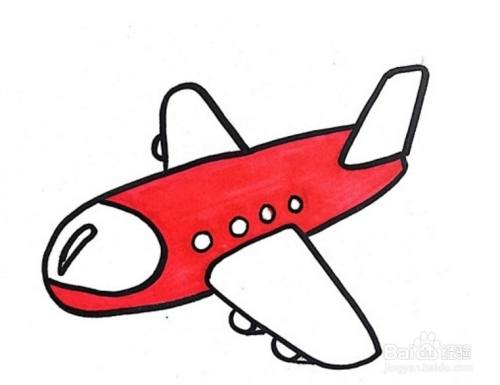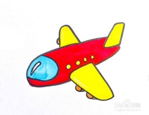 先画出飞机的基本轮廓,画出机身、飞机翅膀和尾部,加上窗户和零件,给飞机的主体涂上红色,翅膀和尾巴、窗户涂上黄色,飞机头部涂浅蓝色,零件涂橙色,简单的儿童飞机就画好了。
