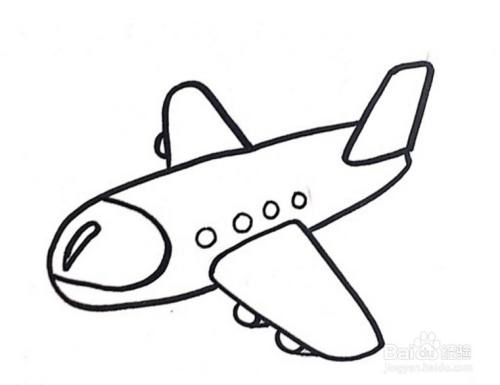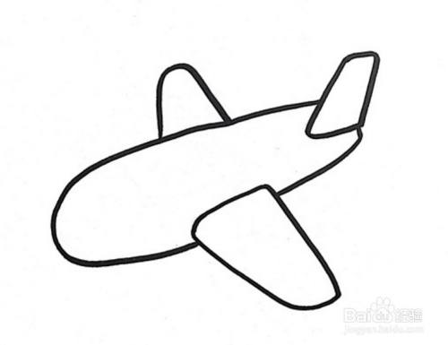 先把飞机的基本轮廓画出来,再画出长长的机身、椭圆形状的头部、梯形形状的飞机翅膀和尾部。