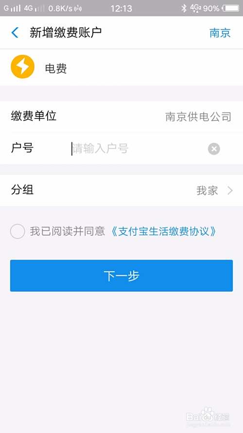 第五步,选择缴费单位,输入户号,选择分组,勾选已阅读并同意《支付宝生活缴费协议》,点击【下一步】,输入缴费金额,就可以缴费了