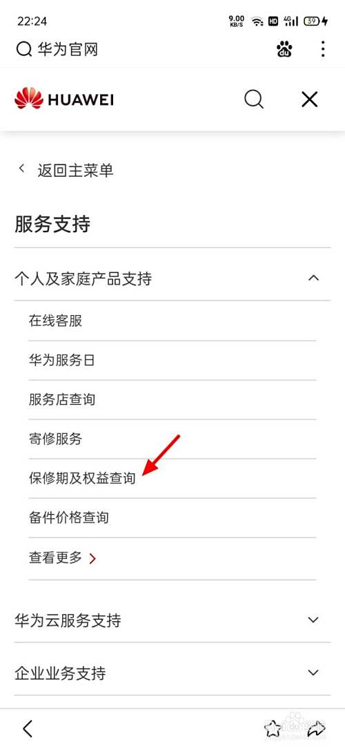 出现下拉,点击保修期及权益查询。