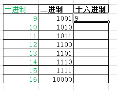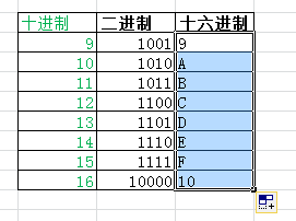 点击十六进制的9,光标放在单元格右下角变成+时,拖动它至所需要的单元格,即可批量复制该公式,最终显示二进制1001~10000的十六进制转换结果9~A,均对应十进制的9~16,如下图所示。