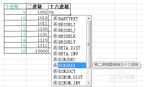 在八进制下面的第一个单元格输入“=B”,在弹出列表中找到BIN2HEX函数,函数后面会有汉字提示,确保正确。双击它,使之填充到“=”后面。