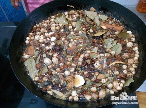 接下来是炸料,为什么要区分大小料,因为它们的形态大小不一,所炸的的时间是不同的,小料一般炸三十分钟左右,大料一般在七十分钟左右,辣椒则需要九十分钟,再炸料的时候最主要控制火候,小火油温控制在一百四十度以下,超过一百四料很快就会炸胡,了炸胡后料不但不出香味反而出异味,这点大家一定要注意,因为一锅料的成本要四百多。。。