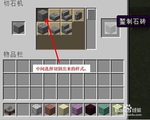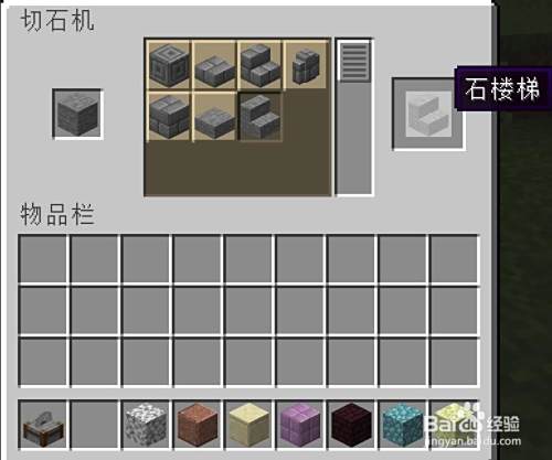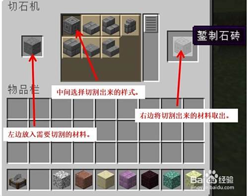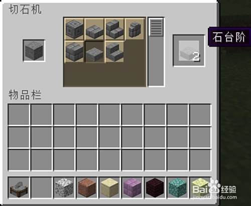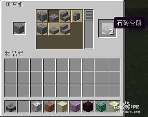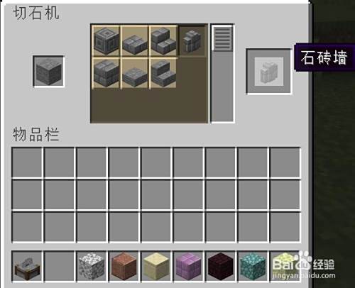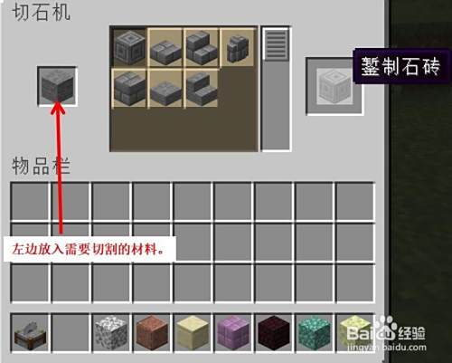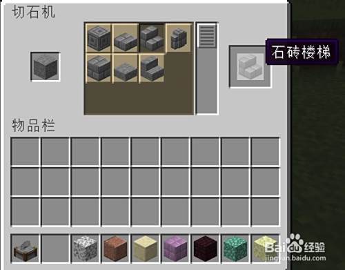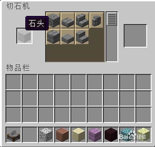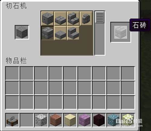 放入【石头】能切出7种样式。石台阶、石楼梯、石砖、石砖台阶、石砖楼梯、石砖墙、錾制石砖。