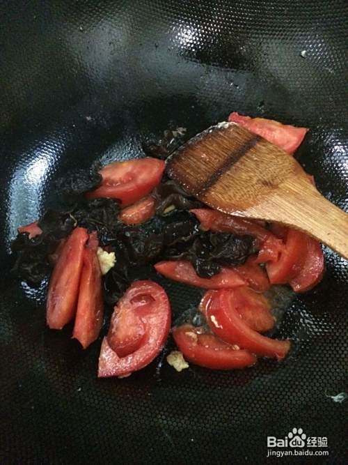 锅里的余油烧热,下番茄翻炒后放木耳继续翻炒。