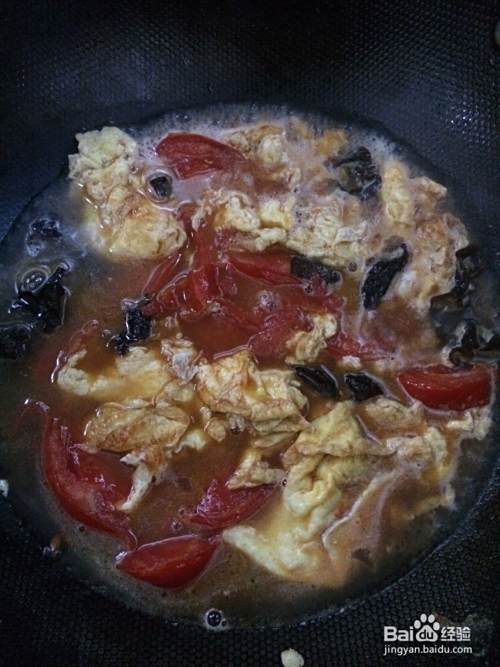接着放盐、放生抽炒拌均匀后加水,刚刚盖住番茄鸡蛋就可以。