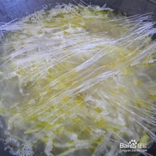 萝卜丝熟透后,在放入粉丝,然后锅中放入盐、鸡精、胡椒粉调味,搅拌均匀,煮至粉丝熟透。