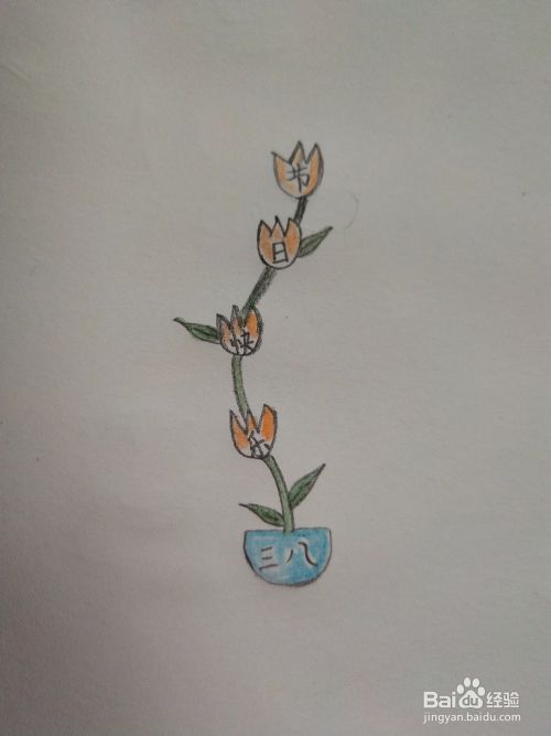 如图,画出花儿下方的花盆,并在花盆上写上“三八”字样。