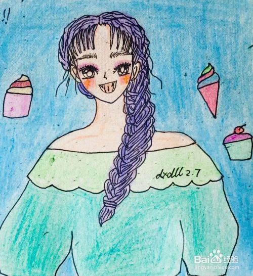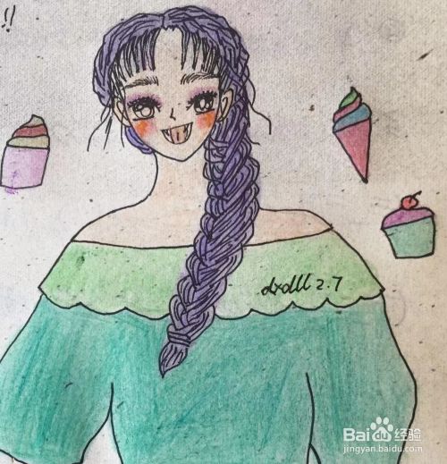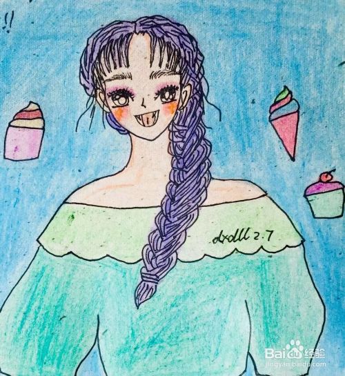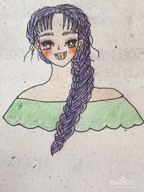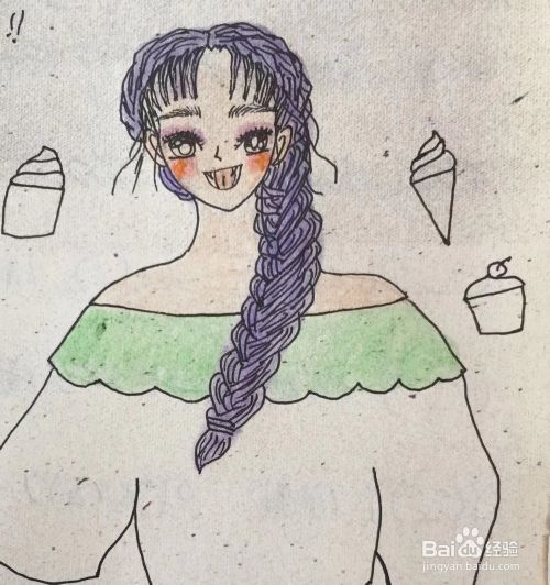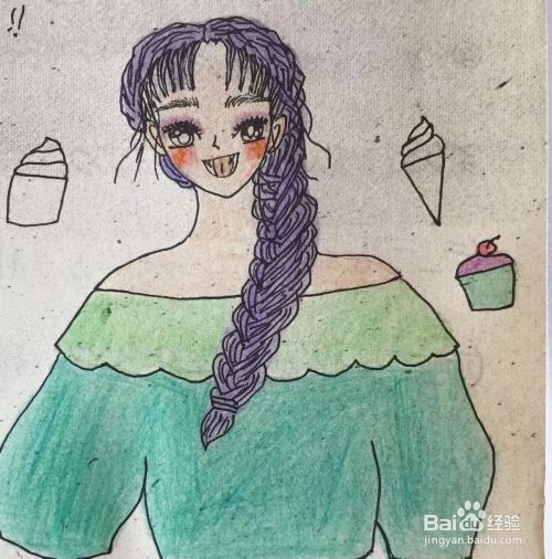 绿色彩铅画笔给服装领口上色,黑色碳素笔画出服装轮廓。湖绿色彩铅画笔给服装上色。浅紫色彩铅画笔给售货员的眼影上色,黄色闪光笔和红色彩铅画笔给腮红上色。肉粉色彩铅画笔给其舌头上色。