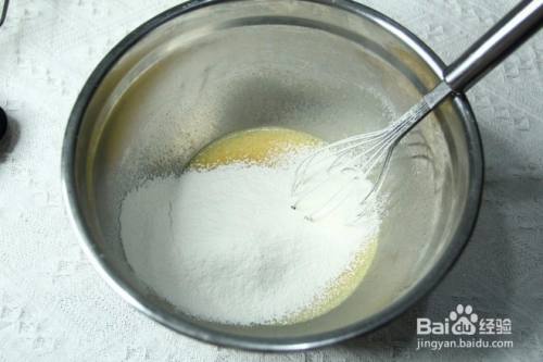 用蛋抽搅打混合均匀,细砂糖要完全融化