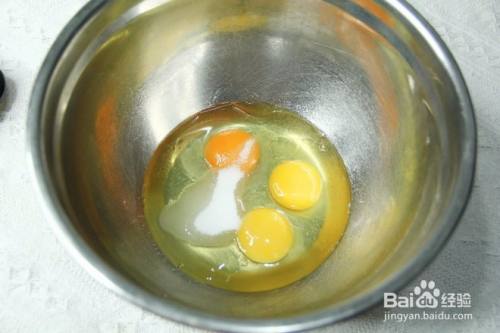 鸡蛋放入干净无水盆中,倒入玉米油、细砂糖。