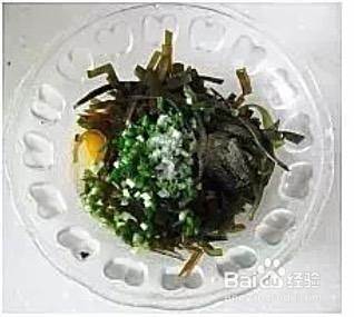 在打好的蛋液中加入海带,大葱,少许盐和料酒。