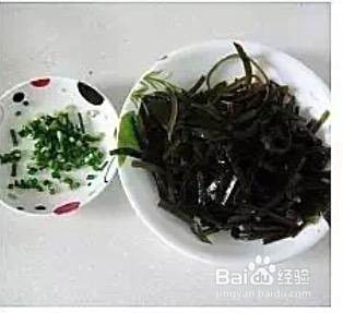 再将海带丝切成3到五厘米长的海带段。此时,准备好葱丝,调味料,香菜待用。
