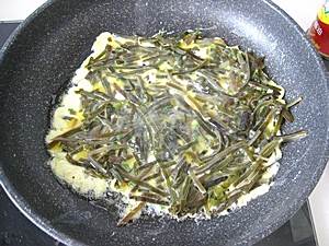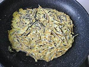 倒入海带,鸡蛋液并且尽量摊平,使饼薄且均匀