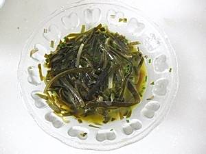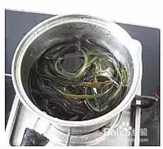 海带切丝,并在沸腾的热水中浸泡,泡的时间越长海带丝越软,可以根据自己的喜好调节浸泡时间。