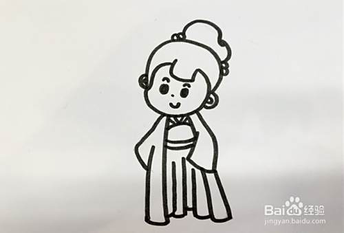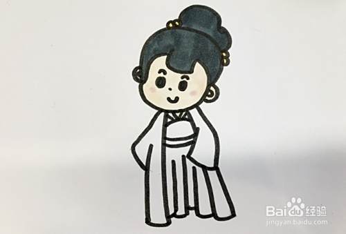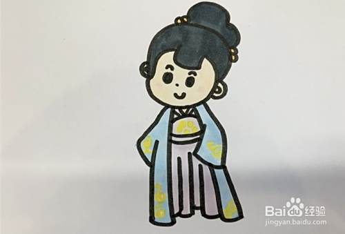 先画出公主的发型轮廓与脸部线条,画出五官表情后,往下画出公主的衣服,给公主涂上肤色后,脸颊两侧画出腮红,头发涂黑,发饰涂上黄色,将衣裙用浅蓝色与浅紫色涂上,并在上面画出黄色的花纹,古代公主就画好啦。