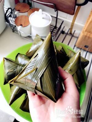 另外拿一片粽叶,垫在粽子的一端,粽叶把粽子周围一圈围住。
