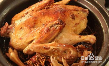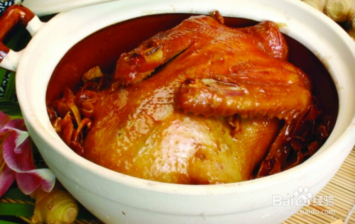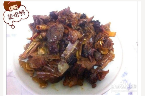 2.食用时,将适量压烂的姜母鸭及原汤舀入火锅,加入包菜叶,调以精盐、味精即成。