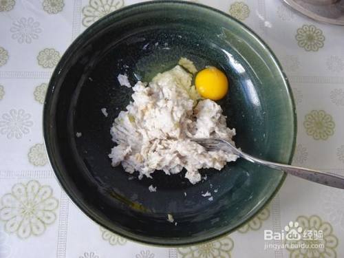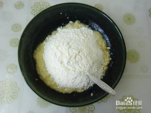 然后放入糖和面粉。不喜欢吃甜口的可以不放糖、放点盐或者什么也不放,保持原味。先搅拌再下手和面