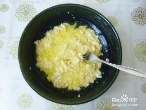 把鸡蛋和芋头泥先搅拌一下,让芋头和鸡蛋液融合,然后再放入食用油。再搅拌一下,没有什么手法,随意翻动就行