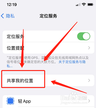 在定位服务页面,点开“共享我的位置”页面。