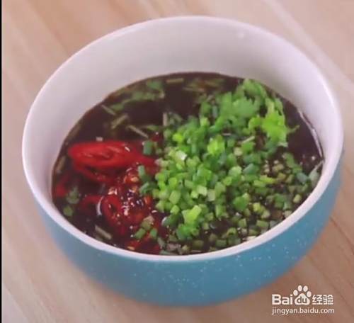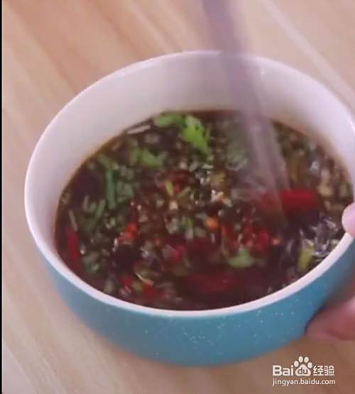 先取小碗,加入生抽、葱末、花椒末、香菜、香菜以及辣椒油等~