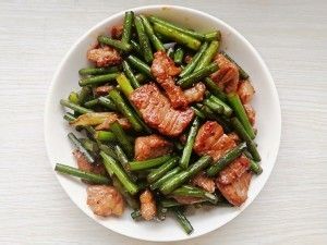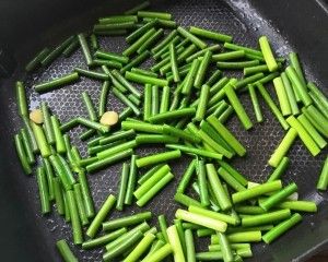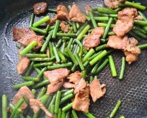 放入姜片,葱段炒几下,放入蒜苔,炒到蒜苔表面有点抽抽就行了(颜色也有变化)