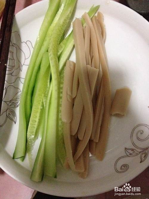 黄瓜去皮,切成细条,香肠切成细条。