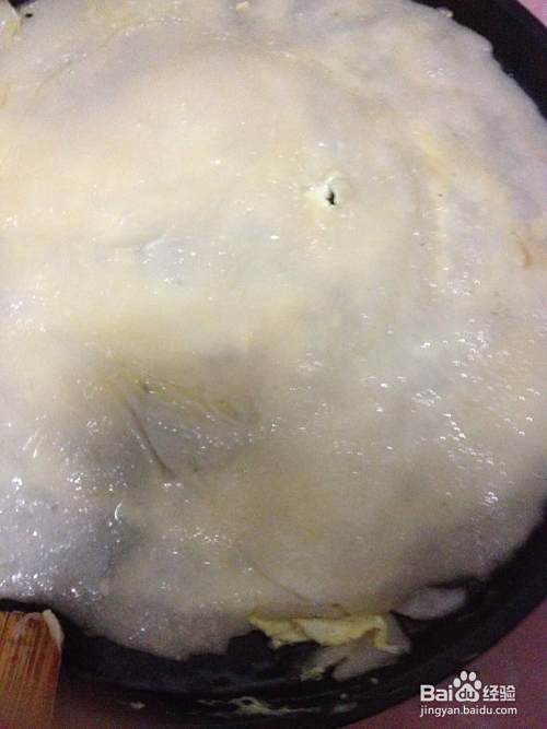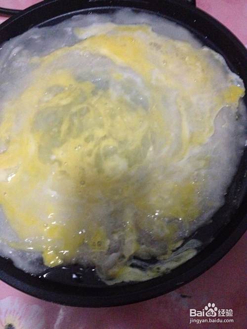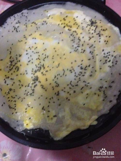 打入一个鸡蛋,均匀的摊平,均匀的撒上很芝麻。