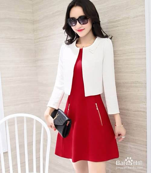 酒红色是最近几年很流行的一种颜色,这款酒红色背心裙和酒红色外套的搭配是非常青春、靓丽的。