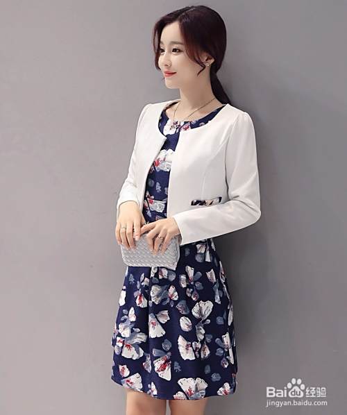 又是一套白色外套的搭配,这里搭配的是一件藏蓝色印花背心裙,也是非常显气质的。