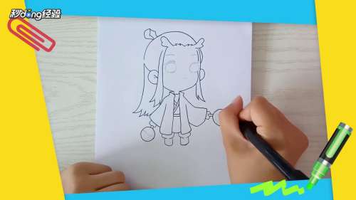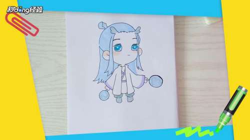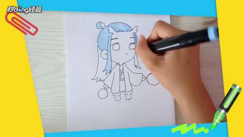 1用铅笔画出卡通敖丙的大致轮廓,然后用黑色的笔描边。