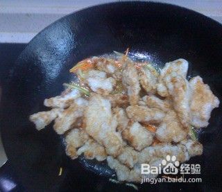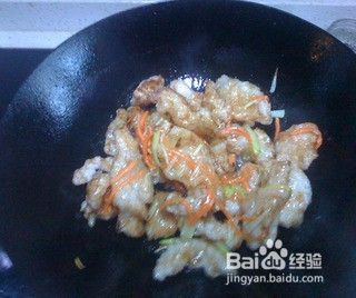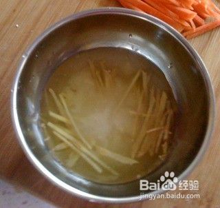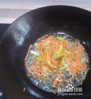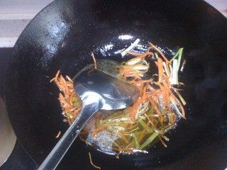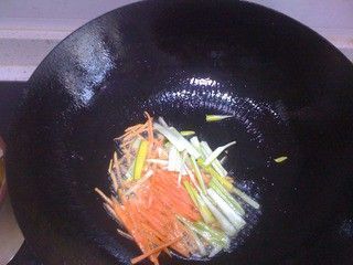 锅内放少量底油,倒入胡萝卜丝,葱丝煸炒