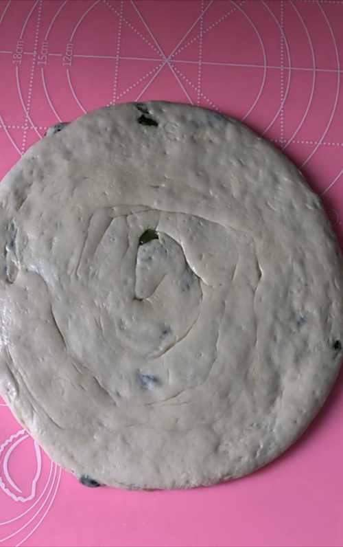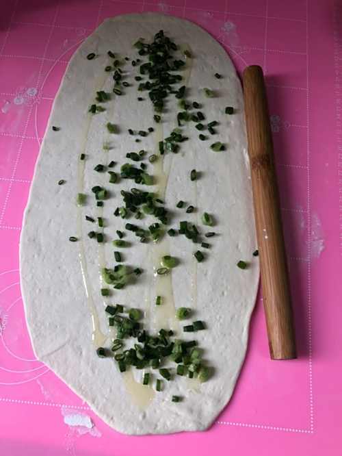 33.在揉面垫上撒少许干面粉,把醒好的面团擀开成椭圆状的薄片,倒适量油、撒盐和葱花。