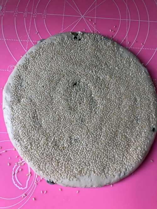 55.在面片上刷点水(有喷水壶更好)撒上白芝麻铺平,让整个面片都粘满白芝麻。