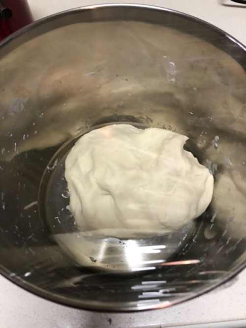 11.水和酵母调匀倒入面粉中搅成絮状揉成光滑面团,我用了鸡肋揉面机,其实也可以直接手揉。附上保鲜膜放冰箱冷藏发酵一晚。